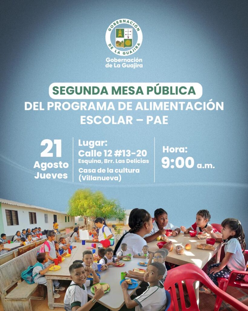 Riohacha, La Guajira, 21 de agosto de 2025. – La Gobernación de La Guajira llevará a cabo la segunda Mesa Pública del Programa de Alimentación Escolar (PAE) 2025 este jueves 21 de agosto, a partir de las 9:00 de la mañana, en la Casa de la Cultura de Villanueva.