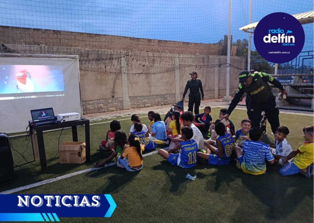 Uribia, La Guajira – Con el objetivo de acercarse a la comunidad y generar espacios de integración social, la Policía Nacional, en articulación con la Secretaría de Gobierno del municipio de Uribia, dio inicio a la iniciativa “Cine al Barrio”, una estrategia preventiva que busca impactar de forma positiva a niños, niñas, jóvenes y familias de los diferentes sectores del municipio.