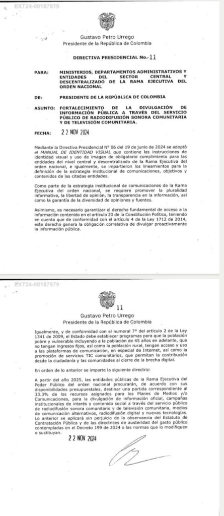 El Presidente Petro ordenó a todos los ministerios entregar una partida presupuestal del 33,3% del plan de comunicaciones para medios alternativos como lo había anunciado en el Encuentro de Armenia, con la finalidad de fortalecer la información pública para los Planes de Medios y/o Comunicaciones, para la divulgación de información oficial, campañas institucionales de interés y contenido social a través del servicio público de radiodifusión sonora comunitario y de televisión comunitaria, medios de comunicación alternativos, radiodifusión digital y nuevas tecnologías.