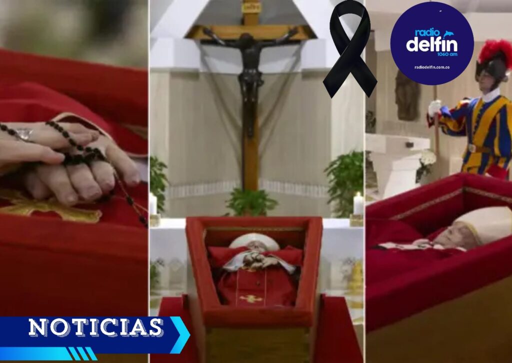 El papa descansa sobre un féretro de madera forrado de terciopelo rojo y en sus manos lleva un rosario, símbolo de su devoción por la virgen.